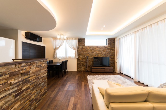 間接照明やアクセントウォールとしてタイルを施した一面の壁で重厚感のあるリビング空間に イエタテ